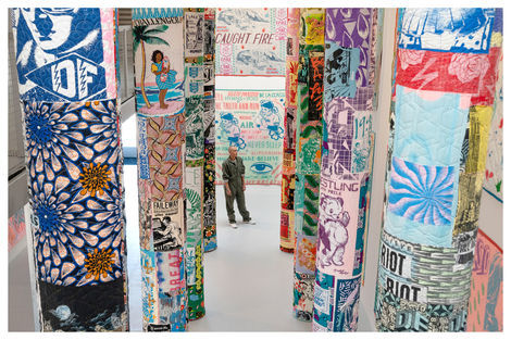 In A Riot of Existence, eight towering quilted fabric columns, traditionally symbols of strength and permanence, are transformed into dynamic, colorful structures that reflect the fluid, ever-changing nature of life. Each column, composed of myriad fabrics and patterns, represents a unique fragment of existence, celebrating the complexity of our experiences, memory, and form. The juxtaposition of rigid classical forms with textured, flowing fabric illustrates the tension and harmony inherent in the riot of existence.