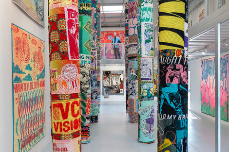 Since 2008, a significant part of their work has been inspired by traditional craft movements, particularly quilt making and woodwork. FAILE found quilt making closely aligned with their collage process—taking disparate elements of type and imagery, each with its own history, and weaving them together to create new narratives and icons. Much like historic quilts that repurposed discarded fabrics into something functional and beautiful, FAILE transforms cultural scraps of time into cohesive works of art.