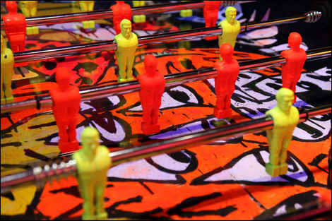 Faile and Bast rebuke the contemporary art world’s fixation on ideas of relational aesthetics and democratization, and give their audience a chance to genuinely engage the work without the looming formality of the traditional gallery. Deluxx Fluxx is entirely interactive, and invites viewers to play a round of psychedelic foosball and take part in the art itself. It is the artists’ intention that viewers will forget they are looking at art, and be captivated by the carnivalesque. The video arcade may be a lost form, but in Faile and Bast’s re-imagining, it gets a temporary and much needed revival.