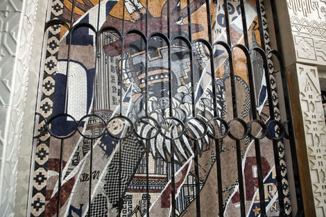 In retrospect, such a project seems inevitable: much of Faile’s recent work, from customized Buddhist prayer wheels to an American flag reworked with Pueblo-inspired linework, relies on re-imagining sacred objects on an increasingly grand scale. This year’s Deluxx Fluxx, a functional arcade bedecked in Faile’s trademark commercial iconography and vibrant palette, was a foray into immersive spectacle. Nevertheless, building a church from the ground up in an Iberian country is a symbolically freighted choice, and one that ups the ante considerably. Not only is sacred architecture deployed here as an artistic medium, it is forced to intermingle with the exotic and profane: Brooklyn-style window bars, new prayer wheels, and sculptural relief depicting Faile’s own idiosyncratic archive.